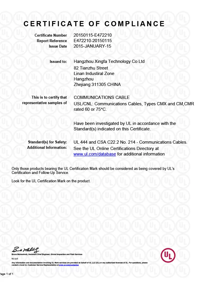 The UL (Underwriters Laboratories) Listing Mark is the most recognized and trusted safety certification for electrical products in the United States and Canada. For cables, it is not merely a label; it is a comprehensive system of product evaluation, factory surveillance, and traceability. When you source cables bearing the authorized UL Mark from Xingfa, you are guaranteeing your customers that the product has been rigorously tested to relevant ANSI/UL standards (e.g., UL 83, UL 44, UL 1424) and is produced in a facility subject to UL's Follow-Up Service inspections. This is your foundational assurance for meeting National Electrical Code (NEC) requirements and passing local electrical inspections.